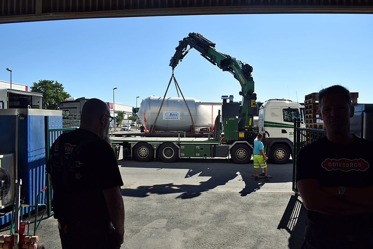 Ännu återstår en del jobb med att ha tanken i produktion, men under måndagen gjordes det stora jobbet med att få in den i bryggeriet. Med hjälp av en effektiv kran och en hel del manuellt jobb kunde tanken ställas på plats. Vid vissa passager var det inte många centimeter till godo, men nu är den på plats och snart blir det mer Starkpilsner till den växande skara öldrickare som väljer just den.