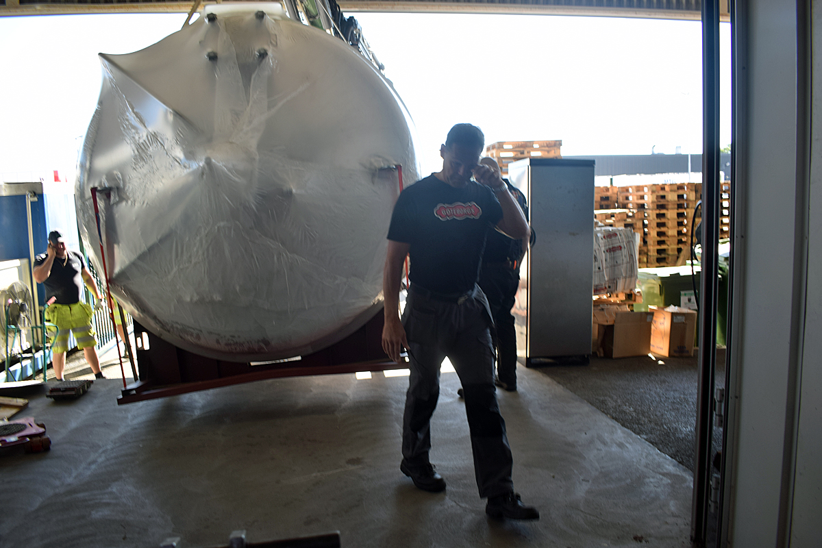 Ännu återstår en del jobb med att ha tanken i produktion, men under måndagen gjordes det stora jobbet med att få in den i bryggeriet. Med hjälp av en effektiv kran och en hel del manuellt jobb kunde tanken ställas på plats. Vid vissa passager var det inte många centimeter till godo, men nu är den på plats och snart blir det mer Starkpilsner till den växande skara öldrickare som väljer just den.