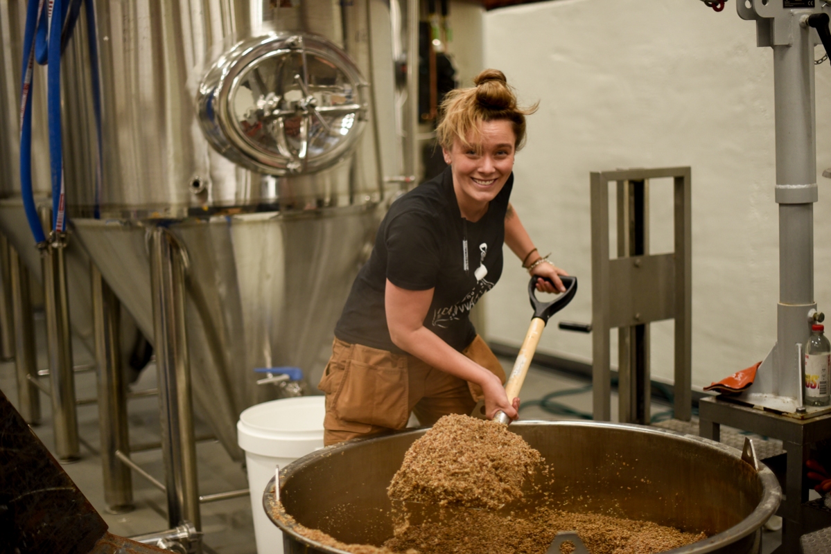 Anna får det tunga jobbet att tömma drav från första koket på Fermenterarnas nya bryggerilokaler.