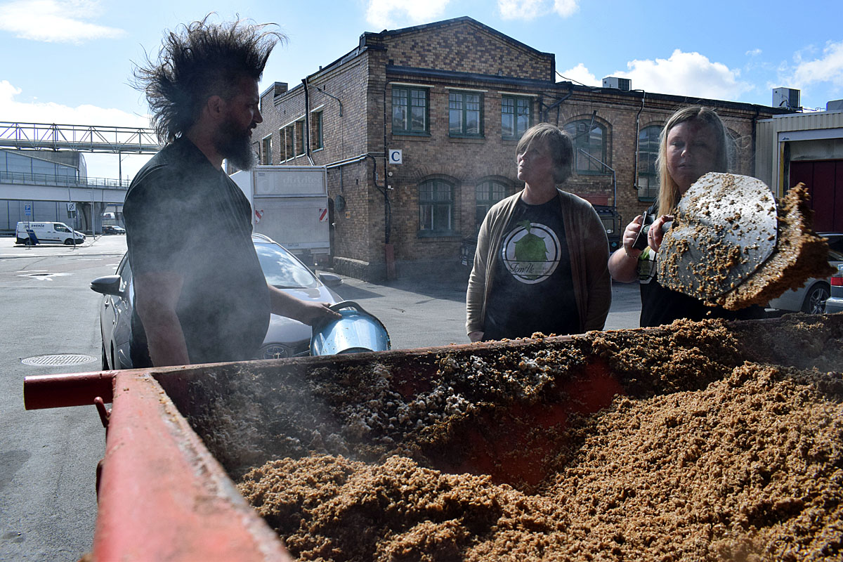 Att skotta drav är bland det tyngsta med att brygga öl. Stefan Gustavsson, Taina Syrjänen och Emma Henriksson delade på jobbet.