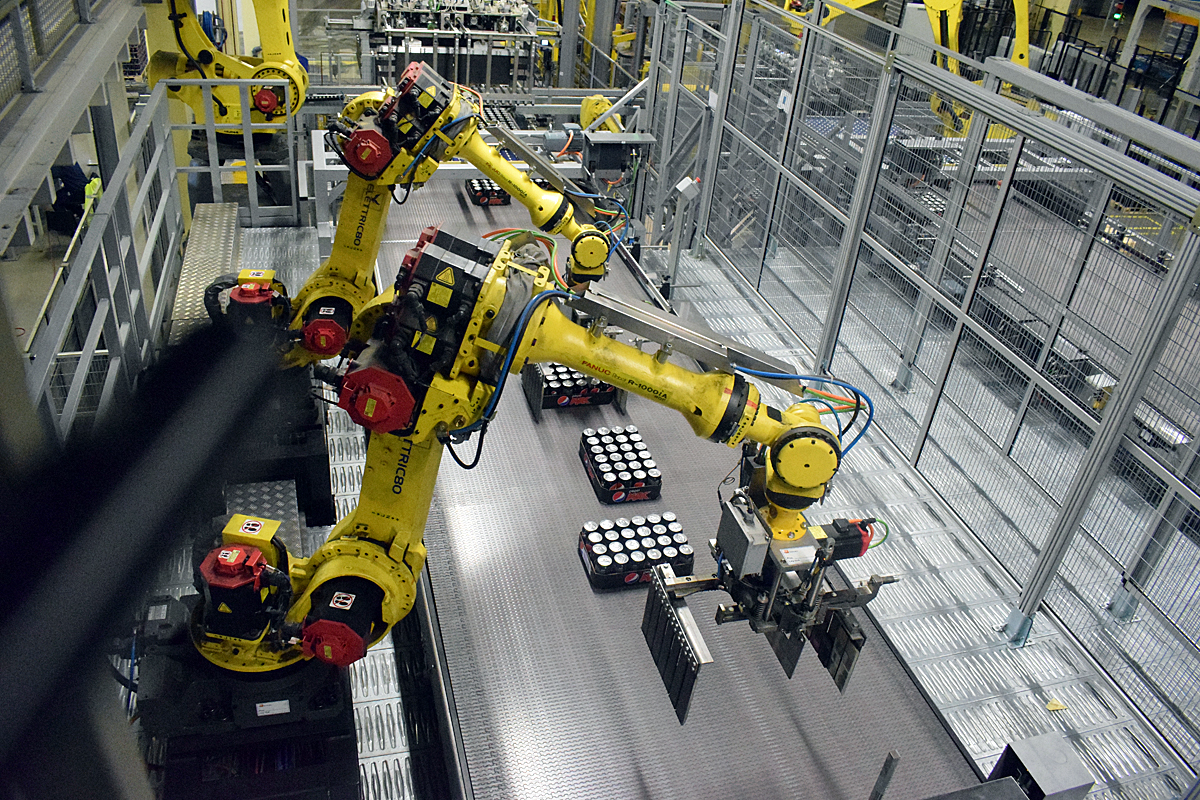Allt sker automatiskt och med hjälp av robotar när läsk och öl paketeras.