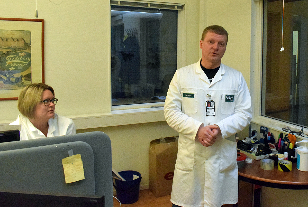 Sergey Koshelev är ansvarig för ölproduktionen på Carlsberg. Till vänster på bilden miljö- och arbetsmiljöchefen Jenny Berglén.