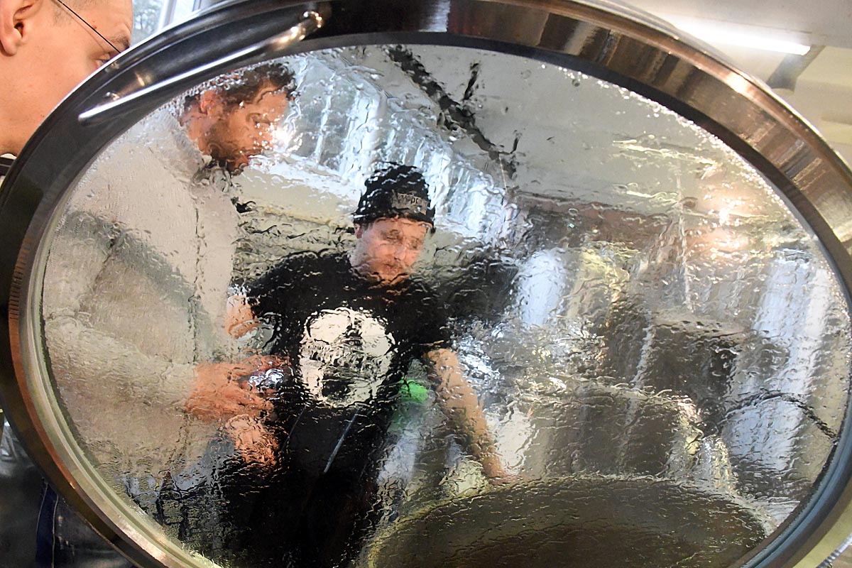 Det bryggdes öl på riktigt under rundvisningen och besökarna fick vara lite försiktiga när locken till de olika pannorna öppnades.