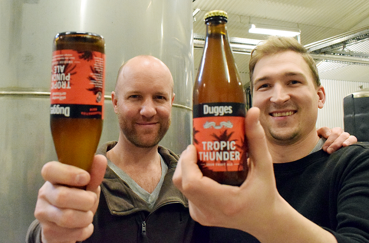 APRIL. Dugges är troligen Sverigeetta på att bjuda in bryggerier till sig för att brygga öl tillsammans. En av de mer spännande bryggarna som hälsade på var Brian Stumke från Stillwater. Tillsammans har de bland annat bryggt ölet Tropic Thunder. Här är Stumke tillsammans med Magnus Dugge Engström.