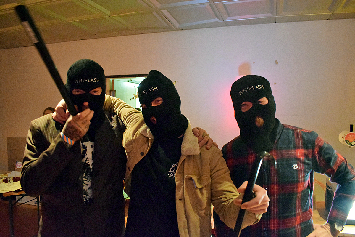 Killarna från Whiplash hade tagit fram skohorn och rånarluvor med bryggeriets namn på.