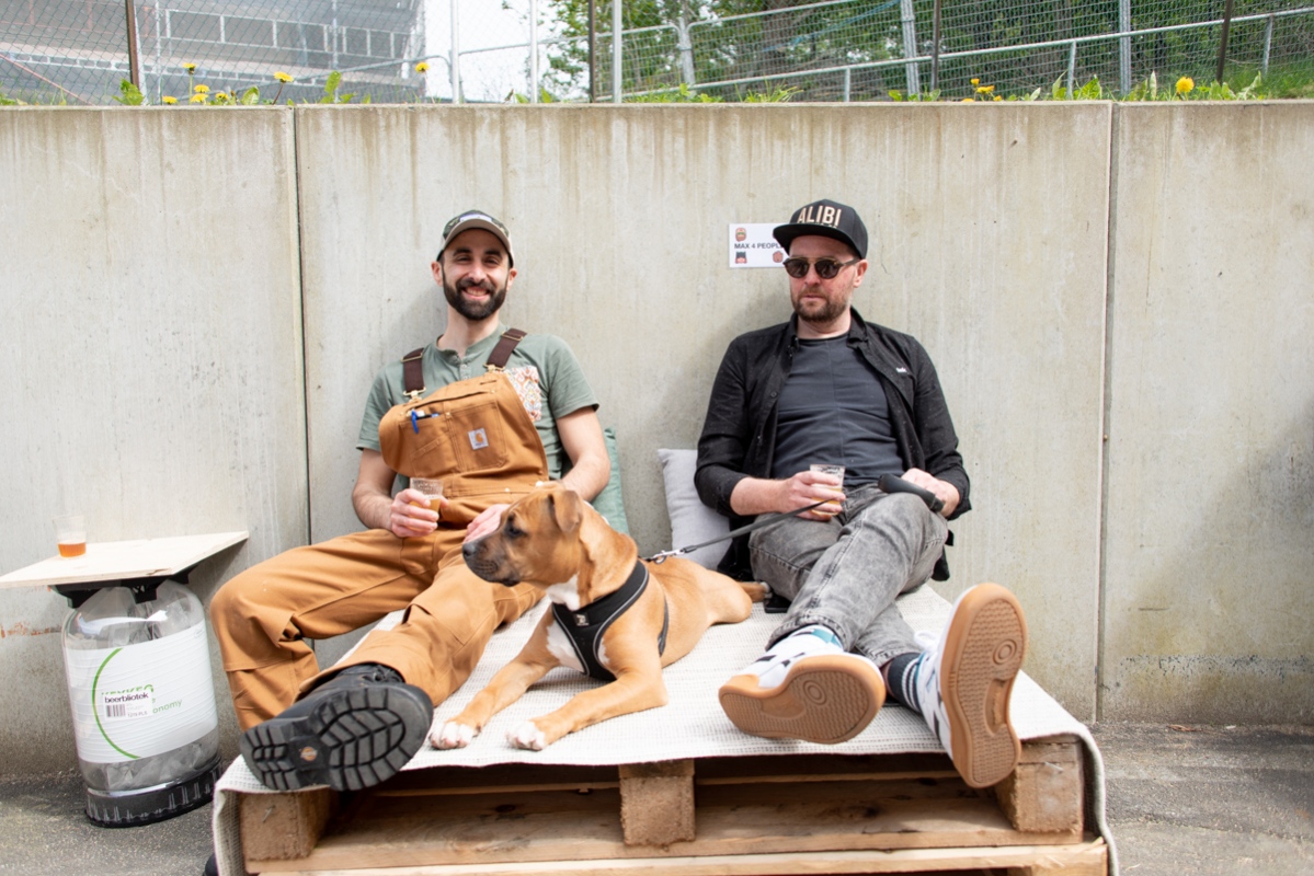 Riccardo Buf och Adam Norman har jobbat klart för dagen och passade på att njuta av solen i sällskap av öl och beernewshunden Citra.