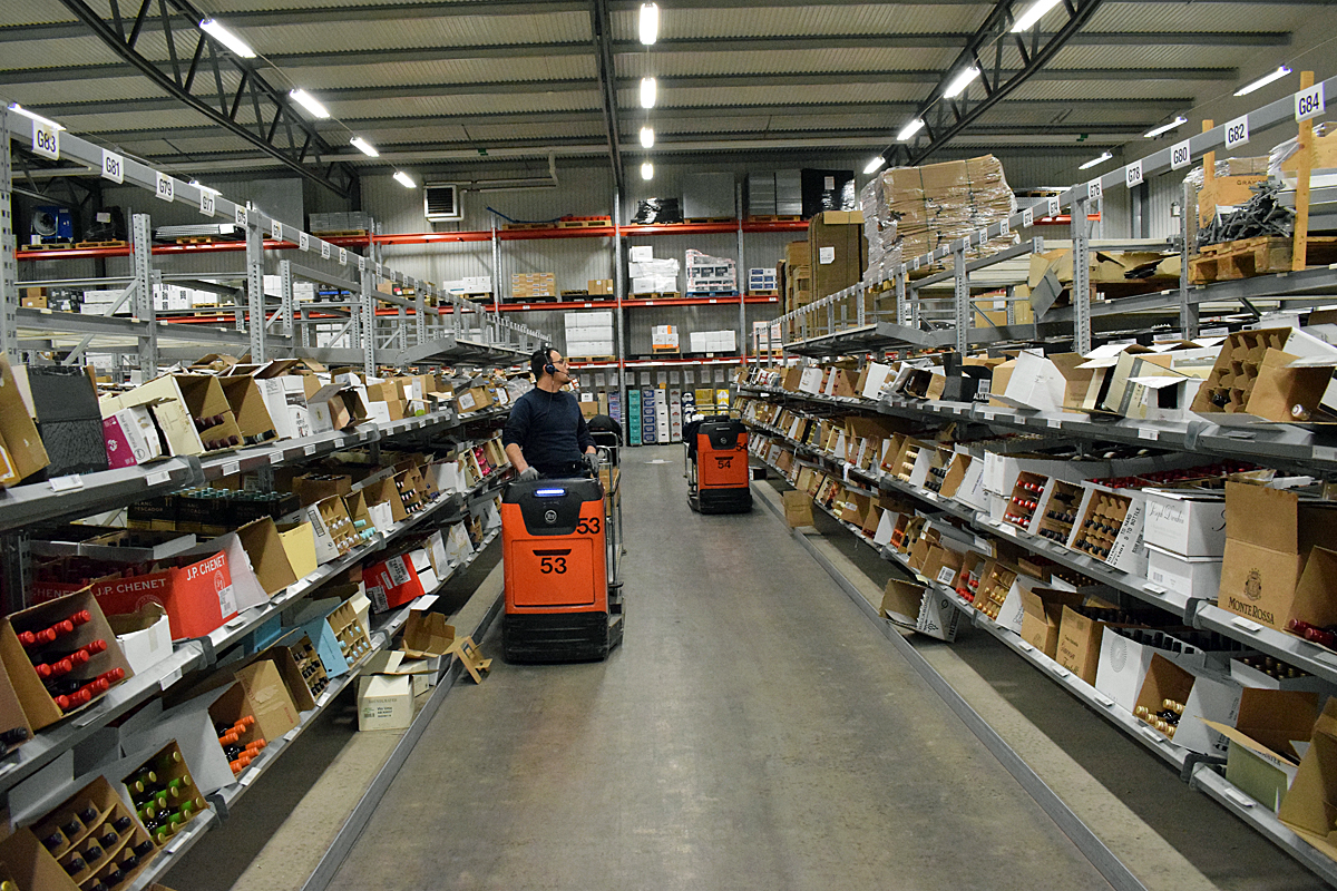 Lagret är på cirka 6000 kvadratmeter och under vårt besök far det runt anställda som ska hämta flaskor åt kunder.