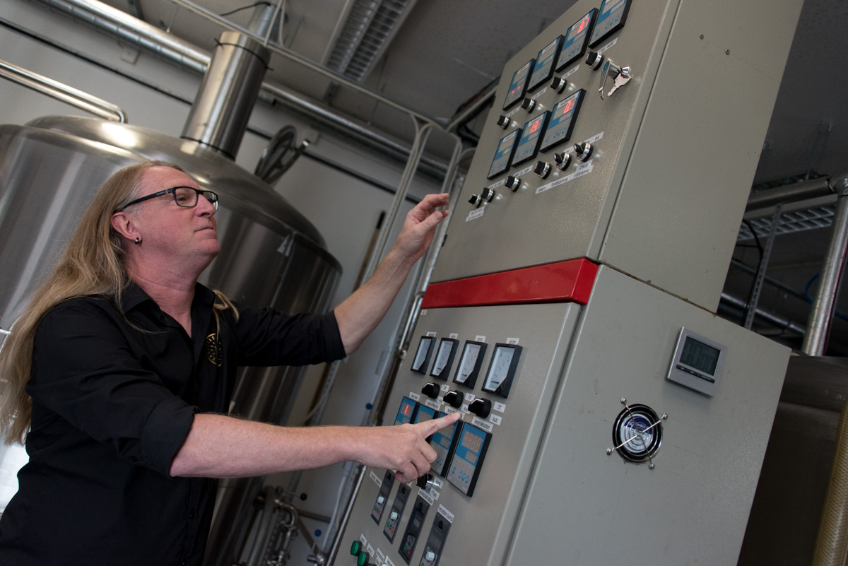 Bryggmästare Larsson vid styrpanelen för bryggeriet. "Jag har den formella titeln efter studier i Berlin, det är alltid kul att retas med. Det kanske inte hjälper mig att göra god öl, men jag har lärt mig hur allt fungerar.