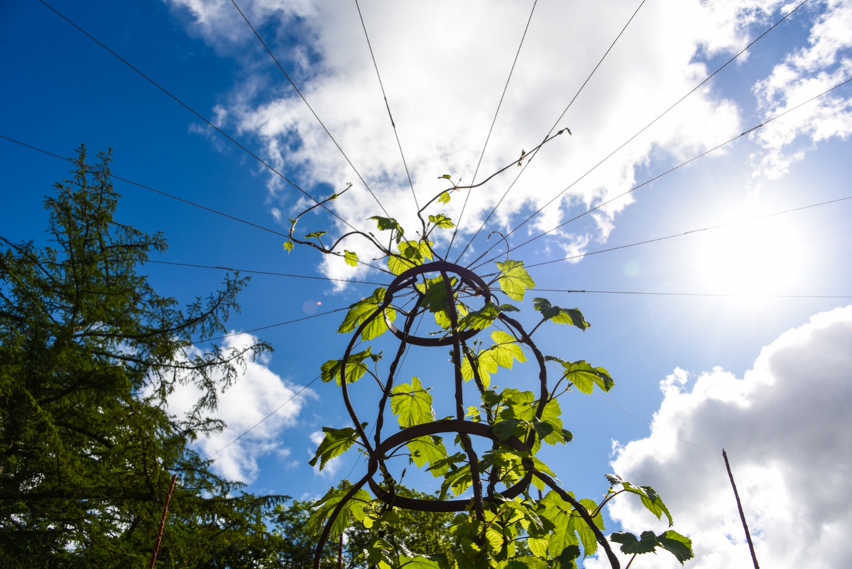Centralt i humlecirkeln har en större planta planterats som ska få växa ut mot stolparna på uppspända vajrar.