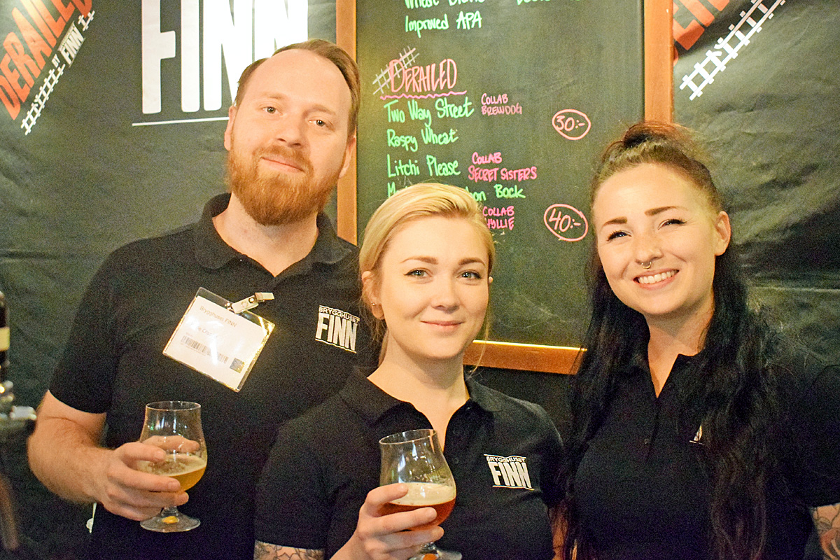 Kalle Olsson, Maria Åkerström och Emily Olofsson skötte om montern för Brygghuset Finn.