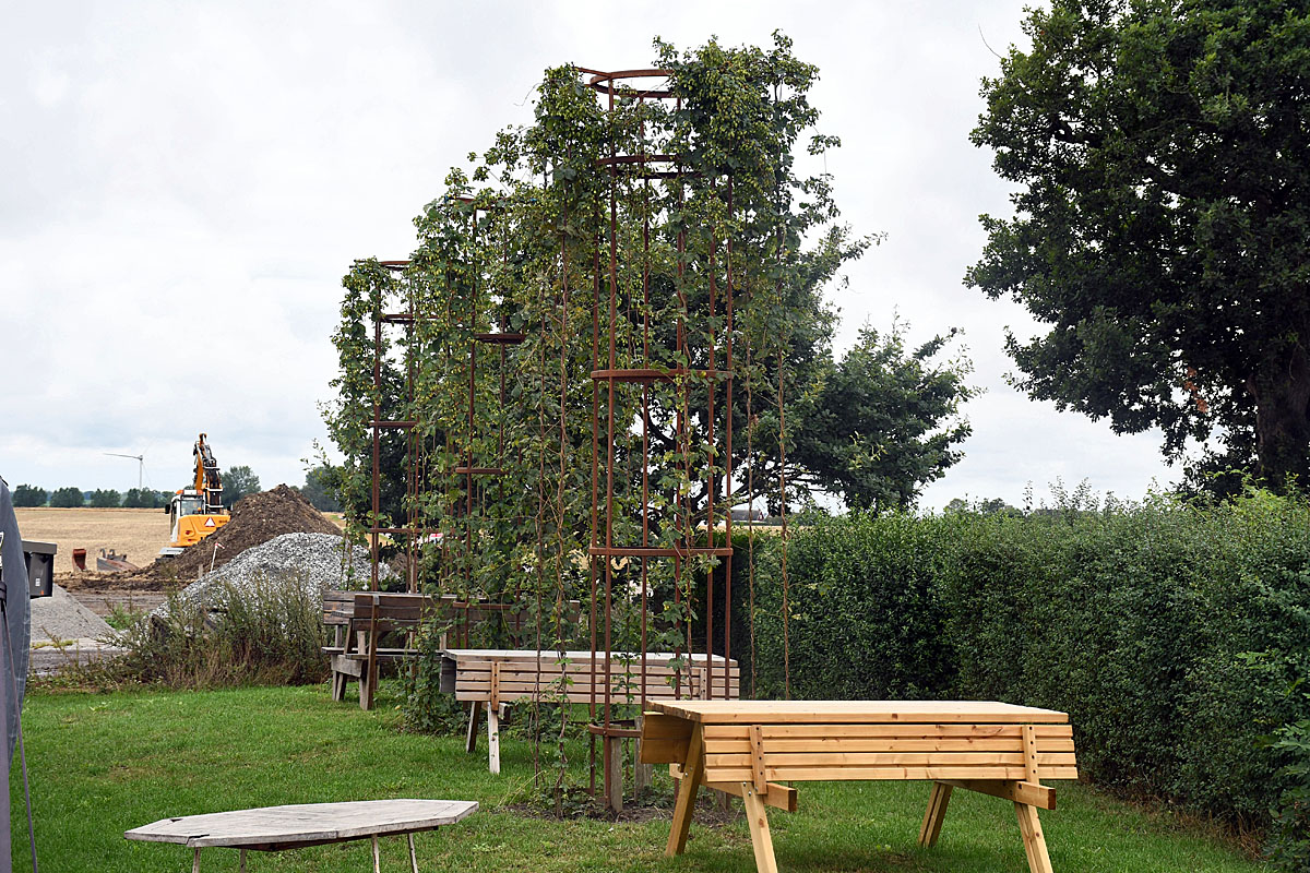 De tre första humleplantorna finns fortfarande kvar på gården.