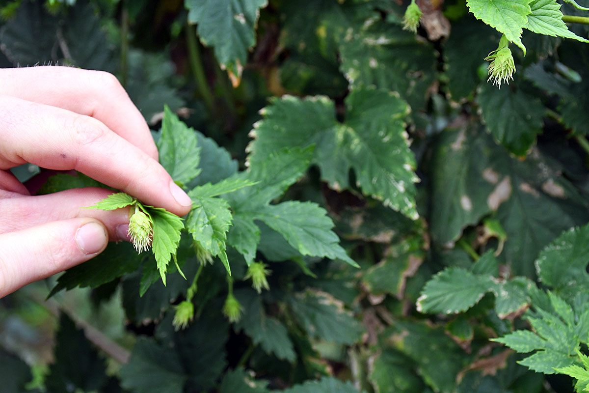 Humleplantorna växer rejält under året och når uppemot åtta meter. Det går åt en hel del tid till att binda upp plantorna i takt med att de växer. Dessutom behöver man hålla koll så att löss och andra skadedjur inte förstör skörden.