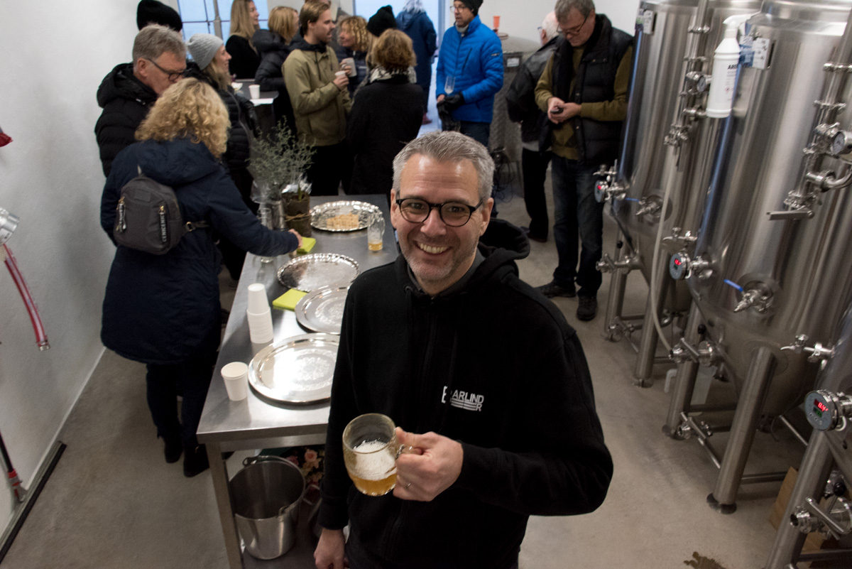 En glad Jonas Barlind i nya lokalerna i Ishuset på Björkö i Göteborgs skärgård. Under ett par timmar hade han slussat flera hundra besökare genom bryggeriet.