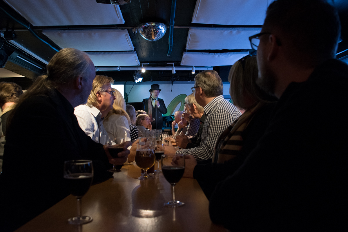 Det var alltså en välvald provningsledare som ledde sammankomsten. Han blandade provningen av de olika ölen med en föreläsning om porterns historia. Efter en inledande öldrink baserad på bland annat bubbel, jordgubbar och Fullers London Porter gick Otto Lundell igenom fem olika öl tillsammans med publiken: Stoodley stout, Mohawk Black Rocket Porter, Meantime London Porter, Stigberget Imperial och Smoked Porter från Alaskan Brewing.