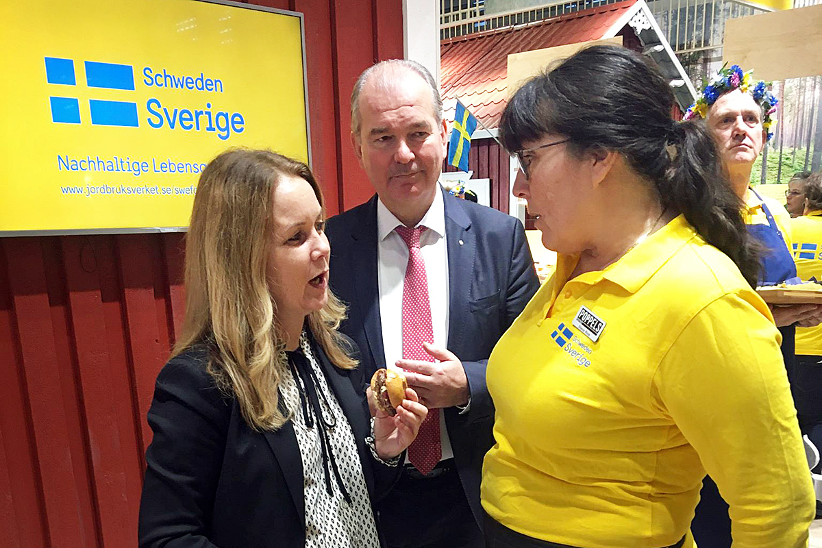 Landsbygdsminister Jennie Nilsson (S) och svenska ambassadören Per Thöresson var på Grüne Woche och hälsade bland annat på hos Diana Rios.