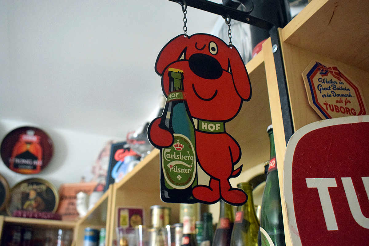 De två rummen har en uppdelning med danska prylar i ett rum och svenska i det andra. Att titta runt där blir en resa i tiden på flera sätt,. Många av bryggerierna i samlingen bryggde sina sista öl för många år sedan, och förr i tiden var heller inte alltid reklamen sådan att den passerat de granskande ögon som finns i dag.