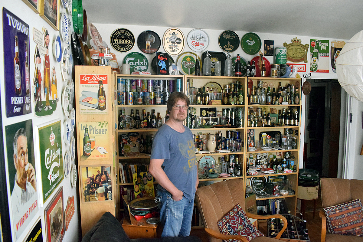 Vi träffas i hans lägenhet i Göteborg och det är ingen tvekan om att ölintresset är stort. Han är delägare i Majornas bryggeri och gillar öl i allmänhet. Men det är när det gäller ölprylar som det blir riktigt nördigt. Två av de tre rummen är helt fyllda med skyltar, flaskor, burkar, brickor och allt du kan tänka dig som är ölrelaterat.