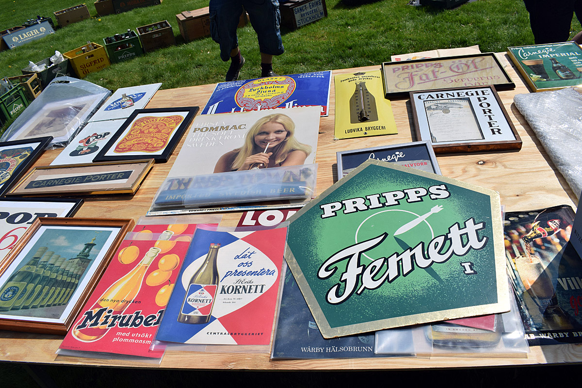 Lars-Åke Jansson är den av utställarna som har med sig flest grejer. Han har kört sina ölprylar på en släpvagn och har flera bord med burkar, flaskor, ölskyltar och annat.