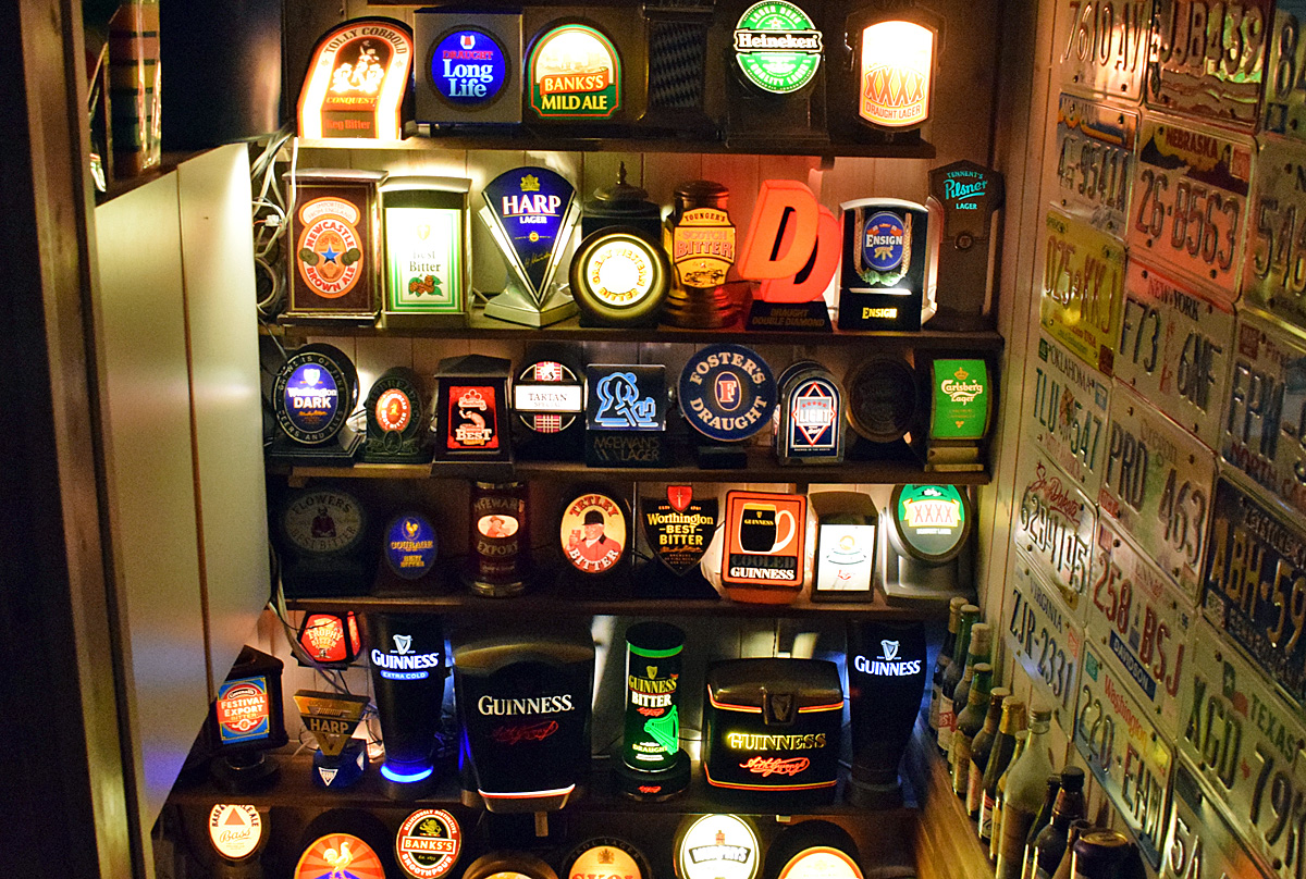 Där finns tapp-skyltar från Storbritannien och registreringsskyltar från alla USA:s delstater. Men också en hel del ölburkar och ölflaskor.
