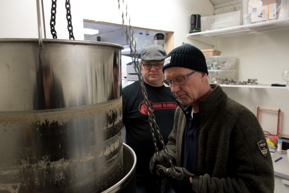 Nicklas Lathvenis väntar i bakgrunden när Thomas Alm hissar upp mäskinsatsen på bryggverket efter mäskningen.
